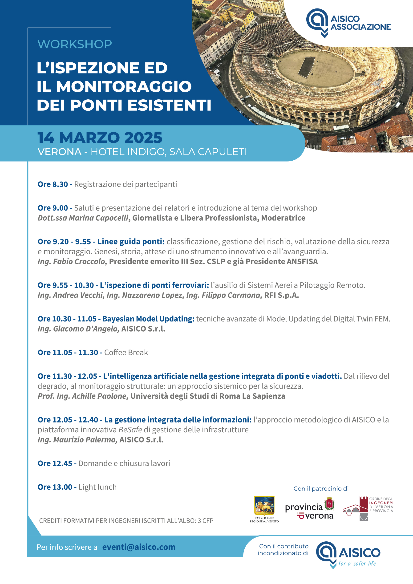 Il workshop ha come scopo quello di aggiornare professionalmente e tecnicamente tutti gli operatori che si occupano di gestione, controllo e monitoraggio delle infrastrutture attraverso le testimonianze dell’esperienza dei gestori, dei progettisti, dei ricercatori e delle imprese, dimostrando come un corretto utilizzo di nuove tecnologie e soluzioni innovative possa contribuire al miglioramento della sicurezza delle infrastrutture. In particolare, si analizzeranno le attuali normative di riferimento, gli strumenti di valutazione dello stato di conservazione delle infrastrutture, l’utilizzo di nuove tecnologie, quali droni, laser scanner, software di intelligenza artificiale, modelli gemelli digitali 3D, e i possibili sviluppi futuri messi a disposizione dalla ricerca scientifica, come ad esempio il coretto utilizzo della analisi predittiva. Il workshop intende, quindi essere, oltre ad una occasione di valutazione delle problematiche, delle tecnologie e degli approcci legati al censimento, all’ispezione, alla classificazione del rischio, alla valutazione della sicurezza e al monitoraggio di ponti e viadotti, un momento di confronto e discussione con i maggiori esperti del settore per la conoscenza delle ultime tecnologie disponibili, della possibilità di nuovi approcci e soprattutto di eventuali sviluppi futuri.